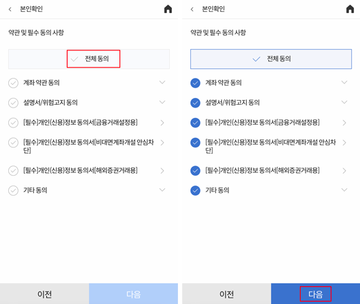 06. 약관 및 설명 고지 동의 전체 동의 클릭 후 다음 버튼 클릭합니다. -