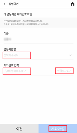 10. 실명확인, 개인 계좌 확인 사용하고 계신 개인 계좌 정보 입력 후 인증, 완료가 되시면 계좌 개설 클릭합니다. -